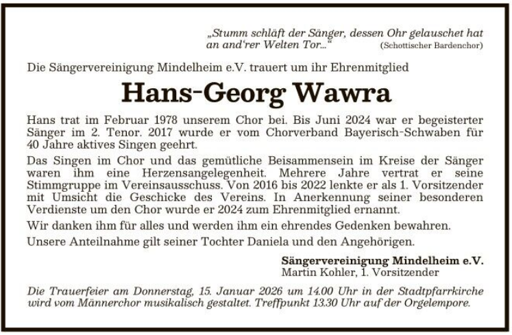 Unser langjähriger Sänger- Kamerad und Ehrenmitglied Hans-Georg Wawra hat uns im Alter von 77 Jahren für immer verlassen.