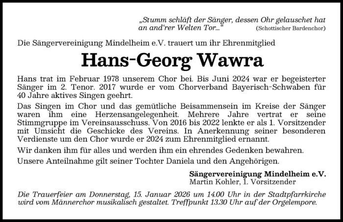 Unser langjähriger Sänger- Kamerad und Ehrenmitglied Hans-Georg Wawra hat uns im Alter von 77 Jahren für immer verlassen.